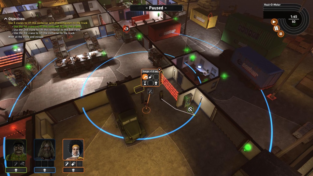 • Kit out your team with all manner of elaborate tools: like camera jammers, chloroform or explosive charges.