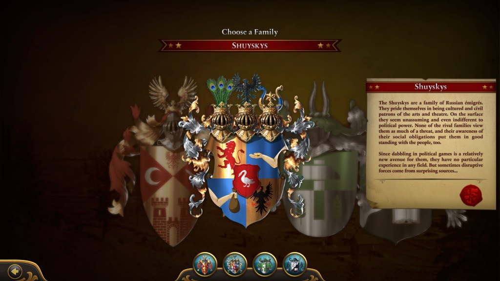 - Choose from 4 ruling families with 5 characters each, like the equal rights and social justice advocates the Kilgannons, or the Sant’Elias, who focus on scientific progress and the pursuit of knowledge.